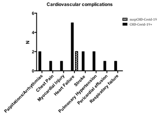 Cardiovascular complications of patients with congenital heart disease and CHD-Covid-19+ (confirmed diagnosis of COVID-19) or suspCHD-Covid-19 (clinically suspected COVID-19). N = number of cases.