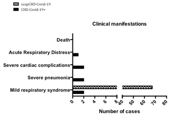 Data were reported for two groups of patients: (i) confirmed diagnosis of COVID-19 (CHD-Covid-19+), if they presented positive nasopharyngeal swabs with suggestive clinical symptoms; and (ii) suspected diagnosis of COVID-19 (suspCHD-Covid-19), if they were exposed to contagion and presented a suggestive history and clinical symptoms, in the absence of confirmation from nasopharyngeal swabs, where they were not performed or not available.