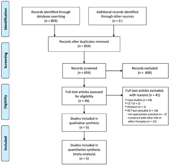 Our search identified 803 potentially relevant trials, of which five studies were included (Figure 1). The data from all of the included trials are summarized in Table 1 [21,22,23,24,25]. All of the included RCTs were performed in China and were published between 2014 and 2019. Four RCTs measured menopausal symptoms using the Kupperman index [21,22,23,24], and four RCTs assessed response rates [21,23,24,25]. There were no ongoing clinical trials for this topic.