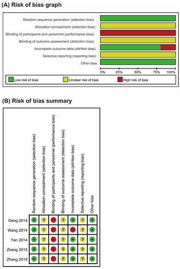 The risk of bias was unclear in most of the domains for the included RCTs (Figure 2). All of the RCTs reported the use of random sequence generation [21,22,23,24,25], and none of the RCTs mentioned allocation concealment or blinding of outcome assessment. The included trials were comparative studies on DLH decoctions versus conventional drug therapies, and blinding of participants or personnel could not be performed. One study did not report the reasons for drop-out and withdrawal of participants [22]. None of the included studies published or registered their protocols, and the reporting bias was unclear.