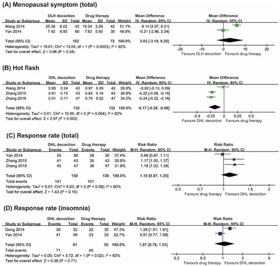 Forest plots of (A) Kupperman menopausal index scores, (B) hot flash scores, (C) response rates (total), and (D) response rates (insomnia).