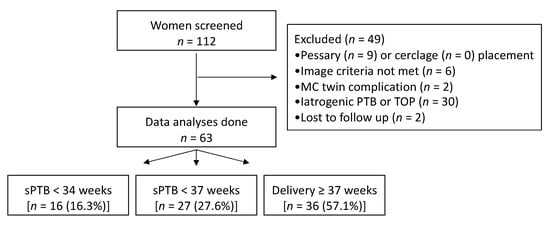 Initially, 121 women were screened, 9 declined transvaginal evaluation, and a total of 112 women underwent a TVU assessment at the time of the routine second-trimester scan. Of these, 63 women were included in the analysis. Flowchart summarizing the inclusion of women is presented in Figure 2.
