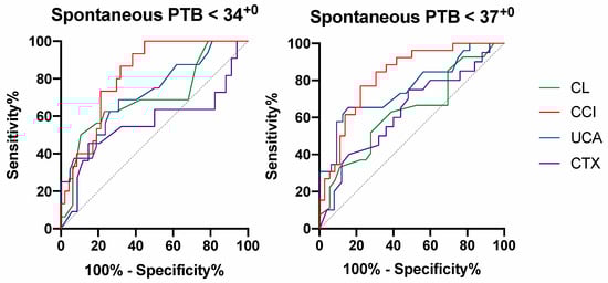 CL had a low sensitivity even if the most optimal cut off for this cohort was chosen, while for the prediction of both sPTB before 34+0 and 37+0, the CCI had the best performance. Specifically, the AUC for sPTB < 34+0 prediction was 0.57 (95% CI, 0.34–0.79) for the CL, 0.82 (95% CI, 0.72–0.92) for the CCI, 0.72 (95% CI, 0.57–0.87) for the UCA, and 0.63 (95% CI, 0.47–0.79) for the CTx. For the prediction of sPTB < 37+0, the AUC was 0.63 (95% CI, 0.49–0.77) for the CL, 0.82 (95% CI, 0.72–0.92) for the CCI, 0.76 (95% CI, 0.63–0.88) for the UCA, and 0.63 (95% CI, 0.47–0.79) for the CTx (Figure 3).