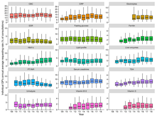 - O’Sullivan, J.W.; Stevens, S.; Hobbs, F.D.R.; Salisbury, C.; Little, P.; Goldacre, B.; Bankhead, C.; Aronson, J.K.; Perera, R.; Heneghan, C. Temporal trends in use of tests in UK primary care, 2000–2015: Retrospective analysis of 250 million tests. BMJ 2018, 363, k4666. [Google Scholar] [CrossRef] [PubMed]