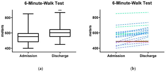 (a) Improvements in 6MWT (6-min walk test) at completion of pulmonary rehabilitation. 6MWT improved significantly after completion of pulmonary rehabilitation. (b) Individual patients’ results for 6MWT at admission and discharge are presented on the right. Thirteen patients improved above a minimal clinical important difference of 30.5 m (blue line). Six patients improved but were below the minimal clinical important difference (green line). One patient did not improve (red line); Abb.: 6MWT, 6-min walk test; ** = p < 0.001, paired samples t-test.