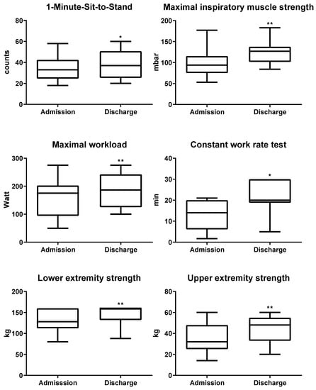 All six secondary exercise outcome parameters showed similar improvements after completion of PR (Table 2 and Figure 2). For analysis of CWR70% and lower extremity strength, 4 and 5 patients, respectively, had to be excluded from analysis. They already reached the maximum measurable outcome at admission, without the possibility of further measurable improvement during PR. For the record, they all reached the maximum outcome at discharge again. At discharge, 1-MSTST performance increased from 35 (±12.6) to 39 (±14.2) times (MD: 3.9 [95%CI 0.4, 7.5]). All patients raised their inspiratory muscle strength measured by Pimax (94.7 (±30.4) to 125.2 (±27.0) mbar; MD: 30.5 [95%CI 23.2, 37.8]). Both cycle ergometer tests, peak performance (156.8 (±63.2) to 188.5 (±57.1) watt; MD: 31.7 [95% CI 19.9, 43.5]) and endurance capacity (CWR70%, 12.7 (±6.7) to 21.2 (±7.7) min; MD: 8.5 [95% CI 3.8, 13.2]) improved greatly. In addition, the BORG dyspnea scale slightly decreased during endurance testing (5.3 (±1.7) to 4.2 (±1.8), MD: −1.1 [95% CI −2.5, 0.3]), while it remained unchanged despite higher workload during peak performance tests (6.3 (±2.2) to 6.0 (±2.3), MD: −0.3 [95% CI −1.6, 1.1]). Furthermore, participants significantly gained strength in upper (34.9 (±12.6) to 44.5 (±11.8) kg; MD: 9.6 [95% CI 5.3, 14.0]) and lower extremities (117 (±17.9) to 146.9 (±16.5) kg; MD: 29.9 [95% CI 23.1, 36.8]).
