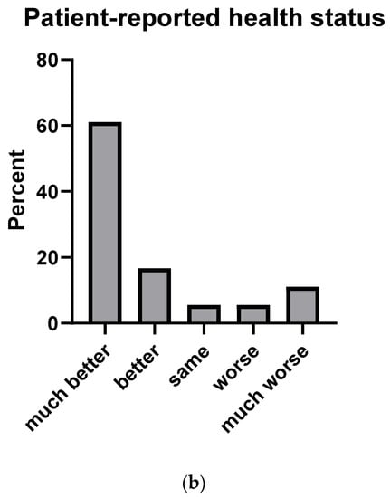 (a) Post-VTE (venous thromboembolism) functional status scale and patient-reported health status at long-term follow up. 0, No significant functional limitations; 2, Slight functional limitations; 3, Moderate functional limitations; 4, Severe functional limitations. (b) 78% reported much better or better health status compared to before admission to pulmonary rehabilitation.