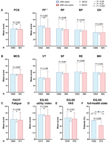 Apart from numerical and statistical differences, we endorsed the concept of minimal clinically important differences (MCIDs), and registered fulfilment of MCIDs in comparisons between AMA users and non-users. Based on previous literature, we set the MCID for SF-36 PCS and MCS scores to ≥2.5 points and for SF-36 subscales to ≥5.0 points [25], for FACIT-Fatigue scores to ≥4 points [26], for EQ-5D utility index scores to ≥0.040 points, used for scores calculated using the US valuation algorithm [27], and for EQ-5D VAS scores to ≥10 points [28]. For MCIDs that in previous studies were meant for evaluation of changes of the HRQoL between different time points, with different benchmarks for improvement and worsening, we considered the greatest benchmark as the MCID for the respective HRQoL item in the cross-sectional design of the present study.