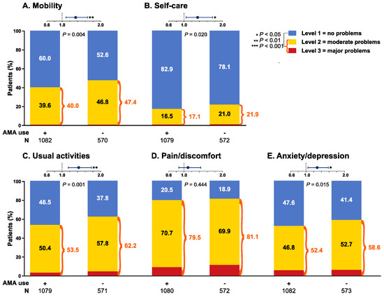 Patients in the AMA group reported higher EQ-5D VAS scores (64.6 ± 19.4) compared with patients who did not receive AMA (61.7 ± 18.6; p < 0.001), but the difference was not clinically important (<MCID; Figure 1). Accordingly, AMA users reported better EQ-5D utility index scores (0.747 ± 0.185) than AMA non-users (0.720 ± 0.192; p = 0.004), but the difference did not reach the MCID. We next analysed the different dimensions of the questionnaire separately: we used the Pearson’s chi-square test to compare AMA groups in relation to patients reporting no problems versus moderate or major problems. In this analysis, a higher proportion of patients reporting no problems was seen among AMA users versus non-users with regard to mobility (60.0% versus 52.6%; odds ratio, OR: 1.35; 95% confidence interval, CI: 1.10–1.66; p = 0.004), self-care (82.9% versus 78.1%; OR: 1.35; 95% CI: 1.05–1.74; p = 0.020), usual activities (46.5% versus 37.8%; OR: 1.43; 95% CI: 1.16–1.76; p = 0.001) and anxiety/depression (47.6% versus 41.4%; OR: 1.29; 95% CI: 1.05–1.58; p = 0.015), but not pain/discomfort (20.5% versus 18.9%; OR: 1.11; 95% CI: 0.86–1.43; p = 0.444) (Figure 2). Finally, the proportion of patients experiencing “full-health state” was higher within AMA users (14.1% versus 10.3%; OR: 1.44; 95% CI: 1.04–1.97; p = 0.026; Figure 1).