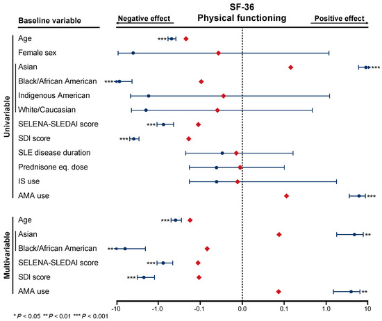 Association between AMA use and SF-36 physical functioning. The forest plots illustrate results from linear regression analysis, employed to investigate the association between AMA use (covariate) and SF-36 physical functioning (outcome), in relation to demographical and disease-specific factors. Factors showing statistically significant associations in univariable analysis were next included in a multivariable model. The dark blue circles represent the un-standardised coefficients, and the whiskers represent the 95% confidence intervals. The red diamonds represent the standardised coefficients. Asterisks indicate statistically significant associations. SF-36: short-form 36; PF: physical functioning; SLE: systemic lupus erythematosus; SELENA-SLEDAI: Safety of Estrogens in Lupus National Assessment SLE Disease Activity Index; SDI: Systemic Lupus International Collaborating Clinics/American College of Rheumatology Damage Index; IS: immunosuppressive; AMA: antimalarial agents.