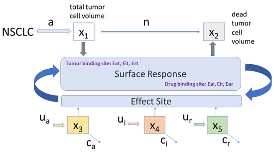 Although evaluated with mouse data, the model is directly scalable to diagnosed/treated NSCLC patients. The advantage of such a minimal PKPD model is that once calibrated for the patient at hand, hence addressing the personalised medicine concept, it can be used for evaluating various combination therapies. Reducing stronger drug doses will minimize side effects and incidence for later toxicity, thereby improving patient tolerance. Exposure–response (E–R) analyses of efficacy and safety can be used to optimize dosing regimens and establish a benefit–risk profile.