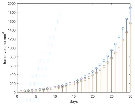 The initial tumor volume was fixed at 1000 mm. The equivalent mass of the tumor from approximation formula 1 mm = mg [36,46] was used to calibrate radiotherapy model parameters via a unit transformation from Gy ⟶ 1/mL. The reported tumor growth volumes are then relative to their initial value.
