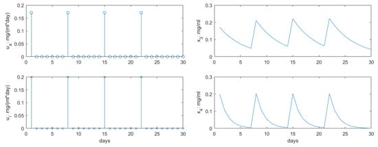 The profiles for inputs and concentrations for AG and IM drugs are given in Figure 3. These profiles correspond to literature studies as given in [18,27], respectively. In order to allow a systematic analysis of the proposed PKPD model, their values and time intervals will remain fixed, allowing to observe the effect of variation in radiotherapy profiles alone.