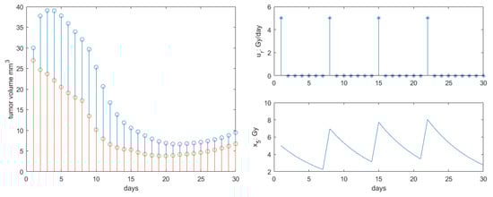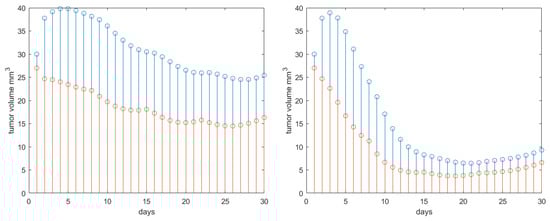 To complete the systematic analysis of the features included by the proposed PKPD model, let us consider variations in patient response, i.e., a patient more responding to treatment if and more resistant to treatment if . The drug synergy was set back to its nominal value . Protocol 3 is maintained for the radiotherapy profile. The results are given in Figure 8. As expected, if the patient response to treatment is higher, a pronounced reduction in tumor growth profile is observed. In presence of drug resistance, we observe an increase in tumor profiles along the 30 days interval with approximately 25–30%.