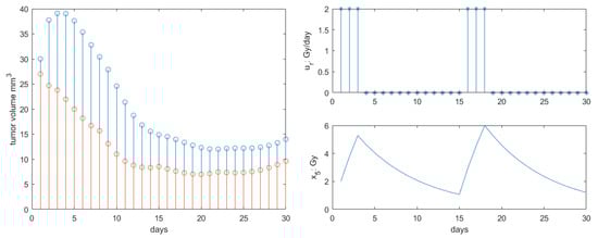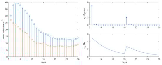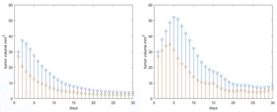 The results for Protocol 3 are depicted in Figure 6. There were no changes in the end tumor volume at the end of the 30 days interval when compared to Protocol 2. However, the retardation degree of tumor growth was somewhat decreased at the mid-interval as the concentration profile was lower than in Protocol 2, as observed from Figure 6—right.
