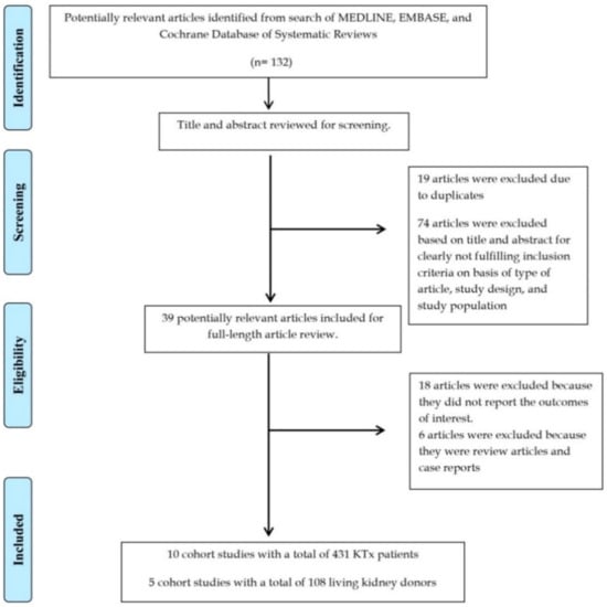 A total of 132 potentially eligible articles were identified using our search strategy. After the exclusion of 93 articles based on title and abstract for clearly not fulfilling inclusion criteria on the basis of the type of article, study design, population or outcome of interest, or due to being duplicates, 39 articles were left for full-length review. Eighteen of these were excluded from the full-length review as they did not report the outcome of interest, while six articles were excluded because they were not observational studies. Thus, 15 studies (10 cohort studies [58,59,60,61,62,63,64,65,66,67] with a total of 431 KTx recipients and 5 cohort studies [68,69,70,71,72] with a total of 108 living kidney donors) were included. The literature retrieval, review, and selection process are demonstrated in Figure 1.