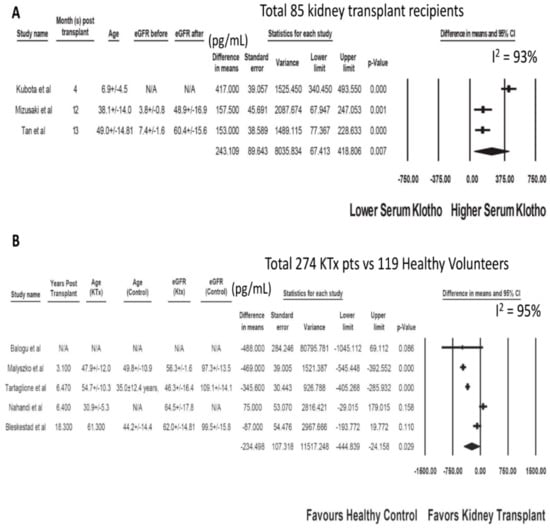 The characteristics of the included studies assessing serum klotho after kidney transplantation are presented in Table 1 and Table 2. After KTx, there was a significant increase in serum klotho levels in recipients (at 4 to 13 months post-KTx) in reference to baseline levels before KTx with a mean difference (MD) of 243.11 pg/mL (three studies; 95% CI 67.41 to 418.81 pg/mL, I2 = 93%), Figure 2A. There were significant reductions in serum PTH and phosphate levels with MDs of −134.65 pg/mL (95% CI −176.09 to −93.21 pg/mL, I2 = 0%) and −2.81 mg/dL (95% CI −3.46 to −2.16 mg/dL, I2 = 97%), respectively. There was no significant change in serum calcium levels with a MD of 0.37 mg/dL (95% CI, −0.05 to 0.79 mg/dL, I2 = 83%). Although KTx recipients had lower serum klotho levels with a MD of = −234.50 pg/mL (five studies; 95% CI −444.84 to −24.16 pg/mL, I2 = 93%, Figure 2B) compared to healthy unmatched volunteers, one study demonstrated comparable klotho level between KTx recipients and eGFR-matched controls [66]. Two studies demonstrated high serum klotho levels in deceased donors as a prognostic marker for good allograft function within one year after KTx (p < 0.05) [59,60].