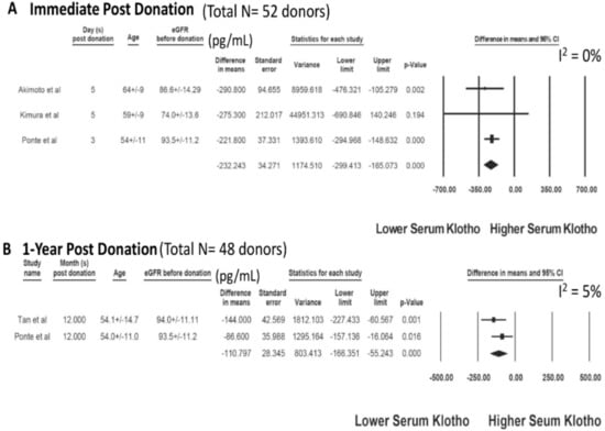Changes in serum klotho after living kidney donation: (A) immediate post-donation and (B) one year post-donation.
