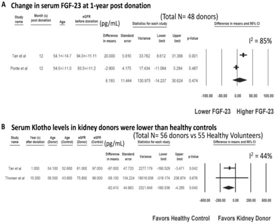 There was no significant change in serum FGF-23 at one year post-donation with a MD of = 8.19 pg/mL (two studies; 95% CI −14.24 to 30.62 pg/mL, I2 = 85%), Figure 4A. Compared to unmatched healthy volunteers, living kidney donors had lower serum klotho levels with a MD of = −92.41 pg/mL (two studies; 95% CI −180.53 to −4.29 pg/mL, I2 = 44%), Figure 4B.