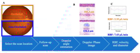 - Nagaoka, T.; Tani, T.; Song, Y.S.; Yoshioka, T.; Ishibazawa, A.; Nakabayashi, S.; Akiba, M.; Yoshida, A. Evaluation of Retinal Circulation Using Segmental-Scanning Doppler Optical Coherence Tomography in Anesthetized Cats. Investig. Ophthalmol. Vis. Sci. 2016, 57, 2936–2941. [Google Scholar] [CrossRef] [PubMed]