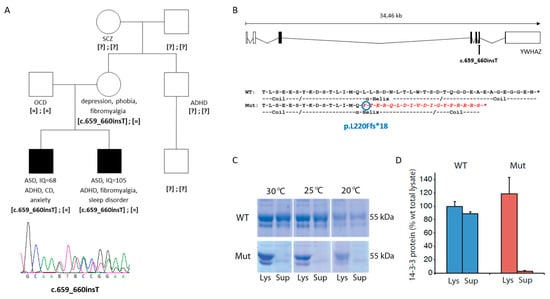 We firstly aimed to assess the functional consequences of a truncating variant (c.659_660insT, p.L220Ffs*18) previously identified in the YWHAZ gene and transmitted from a mother with depression, phobia and fibromyalgia to two siblings both with ASD and attention-deficit hyperactivity disorder (ADHD) []. The maternal grandmother was diagnosed with schizophrenia (Figure 1A), although DNA from this case was unfortunately not available for mutation analysis.
