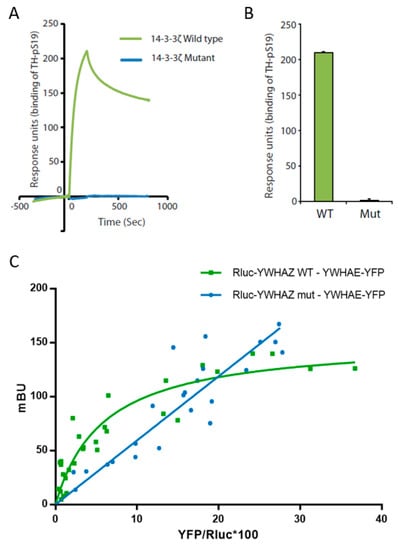 Characterization of mutant 14-3-3ζ binding capacity. (A) Binding of Ser19 phosphorylated human tyrosine hydroxylase (25 nM) to immobilized wild-type GST-14-3-3ζ (green) or mutant GST-14-3-3ζ (blue) using surface plasmon resonance (Biacore 3000, see Materials and Methods for details). The proteins were expressed in the BL21 Codon Plus E. coli strain and purified prior to the analysis. (B) The binding response for Ser19 phosphorylated tyrosine hydroxylase (25 nM) at the end of the injection was compared between 14-3-3ζ WT or Mut and Ser19 phosphorylated tyrosine hydroxylase (TH-pS19) (25 nM) repeated by several immobilizations and injections. Data presented as means and error bars denote the standard deviation (n = 3, p = 1.61 × 10−8 WT vs. Mut, two-sided t-test). (C) Characterization of wild-type 14-3-3ζ (YWHAZ WT) and mutant 14-3-3ζ (YWHAZ mut) interaction with 14-3-3ε (YWHAE) using a bioluminescence resonance energy transfer (BRET) assay. Rluc-YWHAZ WT co-transfection with an increasing amount of YWHAE-YFP gives a saturable positive signal (green), whereas the signal obtained co-transfecting Rluc-YWHAZ mut with an increasing amount of YWHAE-YFP fits with a linear regression (blue). mBU, BRET ratio expressed in milli-BRET units. The relative amount of BRET is given as a function of YFP/Rluc*100, where YFP corresponds to the fluorescence signal due to the increasing amount of donor and Rluc corresponds to the stable luminescence signal measured at 10 min. Values shown correspond to independent experiments (n = 4).