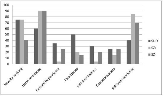 The scarce data published on SZ+ patients suggest that they have a character and temperament profile different from that observed in other groups with DD [25,30]. In some studies, the SZ+ group presented a profile similar to that of the SZ- group, but with higher scores in Novelty/Sensation Seeking [30,52], this trait also being associated with greater severity of addiction [9]. Moreover, increased Harm Avoidance was associated with the presence of more psychiatric symptoms in SZ+ patients [30]. Finally, the data point to the existence of a more marked profile in SZ+ patients when compared to those with SZ- or SUD, which worsens with age or time of consumption [52,53].