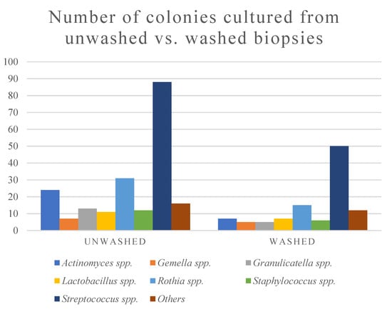 The total number of colonies of cultured Streptococcus spp. decreased, but its relative abundance was higher in the washed biopsies compared to the unwashed biopsies (Figure 2, Table 3). The cultured bacteria in the biopsies were dominated by Streptococcus spp., followed by Rothia spp. and Actinomyces spp. (Table 3).