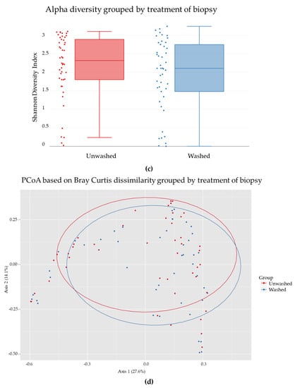 Comparison of the bacterial reads from microbiome analysis of unwashed and washed biopsies from (a) dyspepsia patients and (b) gastric cancer patients (percentages are listed in Table 4). Comparison of (c) the alpha-diversity shown by a Shannon Index, p = 0.22581 and (d) the beta-diversity between the two groups shown by PCoA plot, p = 0.801199, in unwashed biopsies (red) and washed biopsies (blue).