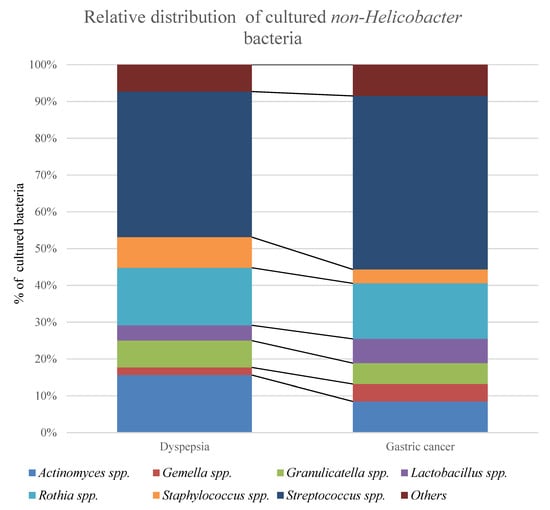 The relative distribution of non-Helicobacter bacteria cultured from the unwashed biopsies showed that Streptococcus spp. were predominant in both dyspepsia patients and gastric cancer patients. The percentages can be found in Table 3. “Others” include Bacillus spp., Corynebacterium spp., Enterobacter spp., Enterococcus spp., Haemophilus spp, Micrococcus spp., Neisseria spp., and Stenotrophomonas spp.