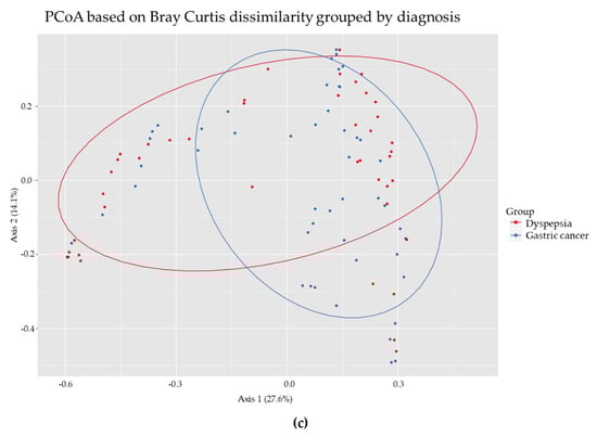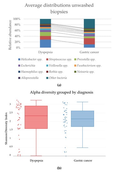 The average relative abundance of H. pylori was not significantly different in untreated biopsies untreated dyspepsia patients and gastric cancer patients (Figure 5a). For most bacterial groups, no significant difference was observed in the distribution of bacteria between dyspepsia patient and gastric cancer patient biopsies. However, a significant increase in the presence of Prevotella spp. was observed in dyspepsia patients (p = 0.0109) and of “other bacteria” in gastric cancer patients (p = 0.0349). This increase in other bacteria may be explained by the dominance of Enterococcus spp. in one biopsy pair, where more than 95% of the bacterial reads were identified as this. If this biopsy pair was removed from the data, the difference in “other bacteria” between the patient groups was not significant. The bacterial diversity in biopsies from dyspepsia patients and gastric cancer patients showed no significant differences within the groups (Figure 5b) or between the distribution of species in the groups (Figure 5c).