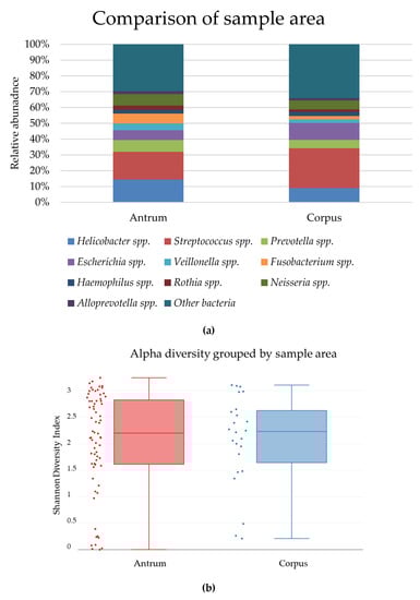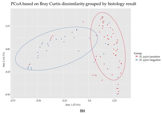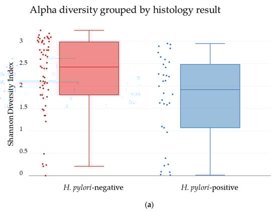 The biopsies determined positive or negative for H. pylori by histology showed significant differences in the bacterial diversity. The H. pylori-negative biopsies showed a significantly higher diversity than H. pylori-positive biopsies (p-value = 0.004353) (Figure 8a). In addition, a significant difference in the bacterial diversity was observed between biopsies determined positive or negative for H. pylori (p-value = 0.0009999), indicating that the presence of H. pylori may change the bacterial community to allow for a unique composition (Figure 8b).