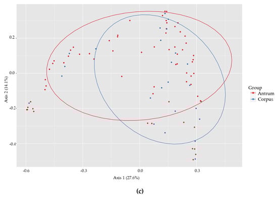 (a) The relative abundance of bacteria in untreated biopsies from the antrum and corpus area of gastric cancer patients. No significant differences were observed in the distributions of bacteria between the two groups. (Percentages are listed in Table 6). Comparison of (b) the alpha-diversity shown by a Shannon Index, p = 0.960995 and (c) the beta-diversity between shown by PCoA plot, p = 0.111888, in biopsies from antrum area (red) and corpus area (blue) in the stomach.