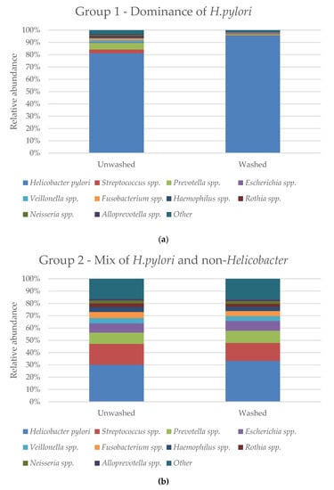 The hypothesis of our experimental setup is that H. pylori is the only true gastric microbiota of the stomach and will be the predominant bacterium that is able to remain in the washed biopsies. Although other studies have shown the presence of non-Helicobacter bacteria in the stomach, these will be expected to be present at least in the unwashed biopsies, as transient contamination from other niches [].