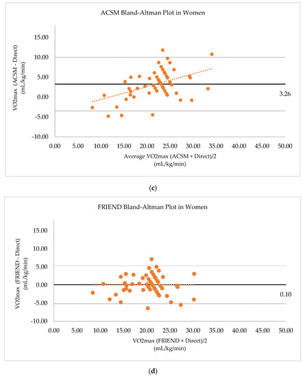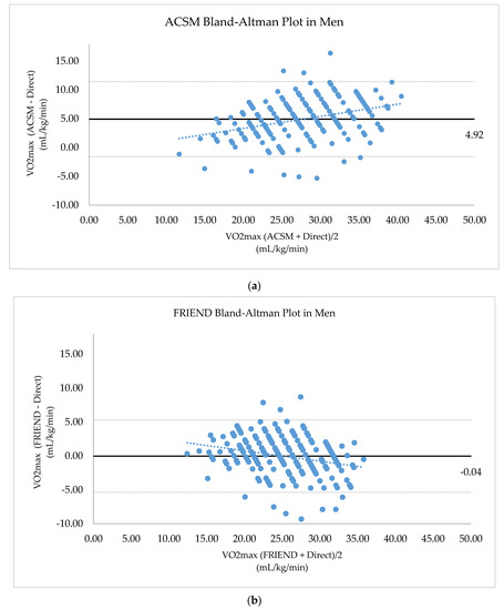 The ACSM equation tends to overestimate VO2max more when higher VO2max. Unlike the ACSM, the FRIEND equation estimates VO2max slightly higher when VO2max is low; the difference is decreased as CRF becomes higher. The FRIEND equation estimates VO2max slightly lower when the VO2max is high. The ACSM equation estimated VO2max, with a mean difference of 4.92 mL/kg/min, higher and the FRIEND equation estimated VO2max, with a mean difference of 0.04 mL/kg/min, lower than VO2max by the direct measurement. (Figure 2).
