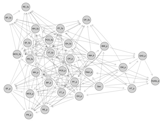 The directed acyclic graph (DAG) of the GBN for predicting postoperative 5-year HRQoL scores. DAG, directed acyclic graph; GBN Gaussian Bayesian network; PF, physical functioning; RP, role physical; BP, bodily pain; GH, general health; VT, vitality; SF, social functioning; RE, role emotional; MH, mental health; PCS, summary physical scale; MCS, summary mental scale; OP, obesity-related problems; BMI, body mass index; SAS, sleep apnea syndrome; HT, hypertension; DM, diabetes; Depr, depression; Dyslip, dyslipidemia; _p, preoperation; _5y, 5-year.