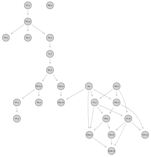 The descriptive statistical analyses were performed using Stata 16.0 (StataCorp LLC, College Station, TX, USA). The Bayesian networks were constructed using package bnlearn [25,36] in software R version 3.62 (R Foundation for Statistical Computing, Vienna, Austria), and the multiple linear and logistic regression models were achieved in R as well.