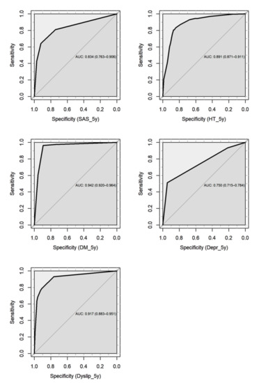 The DBN showed excellent predictive ability for 5-year T2D and dyslipidemia (AUC = 0.942 and 0.917, respectively), good ability for 5-year hypertension and SAS (AUC = 0.891 and 0.834, respectively), and fair ability for 5-year depression (AUC = 0.750) (Figure 3).