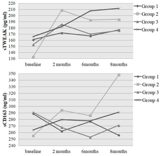 sTWEAK and sCD163 levels of the four groups over the observation time: data of the biomarkers are shown at baseline and after two, six and eight months of training. Data of the biomarkers are given as median. For greater clarity, the percentiles are not shown in the figure, but are shown in Table 3.