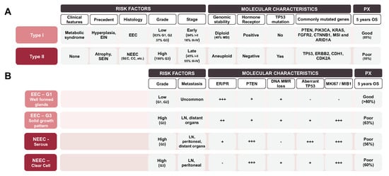 Principle features of the two different subtypes described in the dualistic classification model of endometrial cancer (EC) by Bokhman et al. [] (A) Risk factors, molecular characteristics and prognosis of the dualistic classification. (B) Deconstruction of the dualistic model according to the different histological grades that exist on endometrioid-endometrial cancers (EECs) and the two most common histological subtypes of non-endometrioid endometrial cancers (NEECs). PX: prognosis; OS: overall survival; SEC: serous EC; CC: clear cell EC; EIN: endometrial intraepithelial neoplasia; MSI: microsatellite stability instable; SCNAs: somatic copy number alterations load; Sp.Mlc.alterations: specific molecular alterations; MMR: miss-match repair proteins: SEIN: serous endometrial intra-neoplasia; LN: lymph node status; +++: present/high; ++ frequent; + occasional; - absent/low.