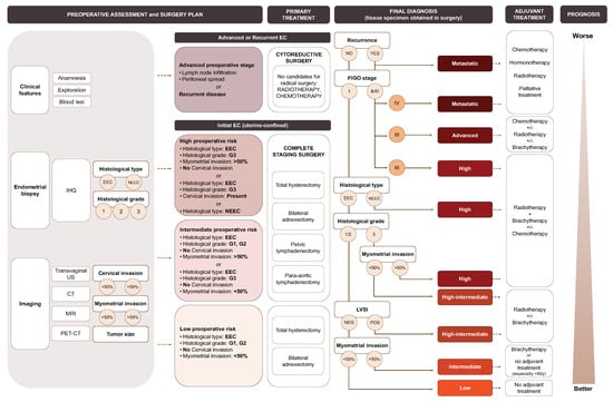 The EC risk stratification system according to the ESMO-ESGO-ESTRO (European Society for Medical Oncology-European Society of Gynaecological Oncology-European SocieTy for radiotherapy & Oncology) consensus [] and its associated primary and adjuvant treatment. Clinical, molecular and pathological characteristics used to predict EC treatment and decision tree showing the clinical and pathological features used for the final definition of EC treatment. IHQ: immunohistochemistry; Transvaginal US: transvaginal ultrasonography; CT: computed tomography; MRI: magnetic resonance imaging; PET-CT: positron emission tomography; EEC: Endometrioid endometrial cancer; NEEC: non-endometrioid endometrial cancer; LVSI: lymphovascular space invasion. The information is scaled down to provide a result on the associated risk, primary and adjuvant treatments, and prognosis.