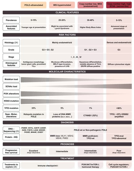- Vermij, L.; Smit, V.; Nout, R.; Bosse, T. Incorporation of molecular characteristics into endometrial cancer management. Histopathology 2020, 76, 52–63. [Google Scholar] [CrossRef] [PubMed]