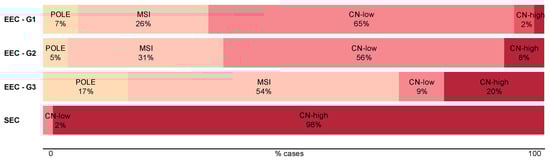 In 2013, The Cancer Genome Atlas (TCGA) Research Network proposed a novel classification system exclusively based on a profound molecular characterization of the tumors []. According to this, EC is classified into four different subgroups: POLE ultramutated, microsatellite stability instable (MSI) hypermutated, copy-number low (microsatellite stable, MSS), and copy-number high (serous-like). The POLE ultramutated group is a small group of all grades EEC and barely a few serous EC [], and is characterized for its excellent prognosis. The MSI hypermutated and copy-number low (MSS) groups are composed of endometrioid tumor histology and they have an intermediate prognosis. They are distinguished because MSI hypermutated subgroup includes most high-grade endometrioid cancers displaying genomic instability, while the copy-number low (MSS) subgroup has a lower rate of somatic copy number alterations. Tumors classified as copy-number high (serous-like) present the worst prognosis. They include serous EC and high-grade EEC with the highest load of somatic copy number alterations (Figure 3).