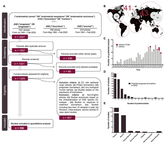 The inclusion criteria were (1) studies including endometrial cancer with an epithelial origin; (2) biomarker studies performed at protein level; (3) prognostic biomarker studies, i.e., studies that identify or validate biomarkers that are associated to EC risk factors, recurrence or survival; (4) studies performed on any biological human sample, but not on cultured cells or animal models; (5) studies based on the expression of biomarkers. Exclusion criteria were articles (1) not written in English; (2) based on the characterization of one specific EC subtype; (3) based on response-to-treatment biomarkers; (4) articles performed using less than 10 samples in total; (5) reviews, meta-analyses, opinion articles or case report studies.