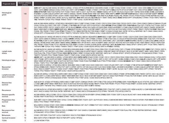 As shown in Figure 6, the majority of biomarkers identified in this systematic review were associated with histological grade, FIGO stage and OS, with more than 100 biomarkers described for each of these parameters. Other biomarkers were associated with lymph node status, histological type, myometrial invasion, LVSI, DFS, recurrence, DSS, PFS, risk, RFS, metastasis, cervical invasion and the TCGA subgroups (Figure 6). The vast majority of biomarkers are related to more than one of the above-mentioned parameters, indicating that they provide relevant prognostic information but are not specifically linked to one feature in particular. In fact, those that were associated with a specific parameter (in bold in Figure 6) generally corresponded to those biomarkers that have been scarcely studied. Thus, further research needs to be performed to understand whether they are truly significant as prognostic factors and specific of that parameter in particular or might be also related to other parameters.