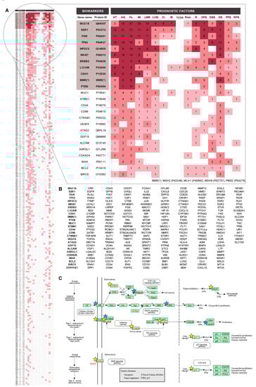 Most of the candidate prognostic biomarkers are involved in common biological processes, such as cellular processes, biological regulation, metabolic processes, response to a stimulus, cellular component organization or biogenesis and signaling and also, proteins that are part of the basic structural and functional units of the cell. In order to become promising biomarkers, the potential of any specific protein should be validated in different cohorts, and if possible, by independent groups, and in prospective studies. According to our findings, 11 proteins have been extensively studied, i.e., in more than five independent studies (Figure 7A). Importantly, all these proteins have also been described as diagnostic biomarkers and are the main drivers of the oncogenic pathways related to EC (Figure 7B,C) [,].