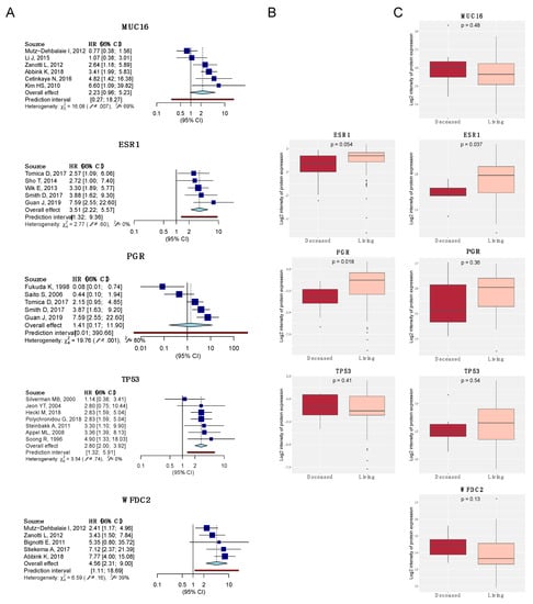 Meta-analysis on OS of the most studied biomarkers regarding prognosis in EC (MUC16, ESR1, PGR, TP53, and WFDC2, respectively). (A) Forest plots. Diamond in light blue represents the point estimate and confidence intervals when combining all studies; (B) expression boxplots using the RPPA data of the TCGA cohort (n = 200:20 deceased–plotted in red; 178 living–plotted in light red) []; (C) Expression boxplots using the mass spectrometry data of the CPTAC cohort (n = 100:7 deceased–plotted in red; 38 living–plotted in light red) [].
