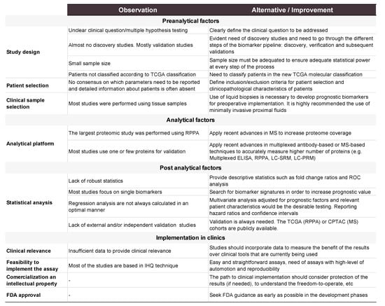 This systematic review and metanalysis underline the lack of potential prognostic biomarkers of EC. Among the 2507 articles identified in this review, 398 were deeply analyzed. As a result, this review compiles information of 255 potential biomarkers, which are related to one or more of the clinical prognostic factors in EC, recurrence or survival. Although a large list of biomarkers is described, there are critical issues that hamper their clinical application and that are discussed in this section, from a conceptual, methodological and analytical point of view. Additionally, new strategies in biomarker research are exposed. The main points of this section are summarized in Figure 9.