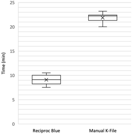Retreatment working time. Manual technique required statistically significant more time than RB. In both techniques the clinical parameter to step the retreatment procedure was the absence of debris from instrument removed from root canals.