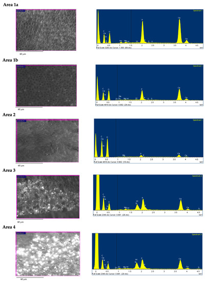 Area 1 identifies a sound smooth instrumented dentin free from any smear layer. All dentinal tubules proved open and clean (no smear plugs/sealer debris inside). This area was subdivided into two subgroups, as EDX investigation revealed differences in the surface chemical compositions of intratubular dentin substrate. In Area 1a, sound dentine surface proved the typical chemical composition of dentinal apatite mainly composed by Ca and P (both attributable to the inorganic composition of apatite) and N (from dentin organic components, i.e., collagen). Area 1b revealed a similar ESEM morphology, but EDX spectra revealed no traces of N, the trace element of collagen.